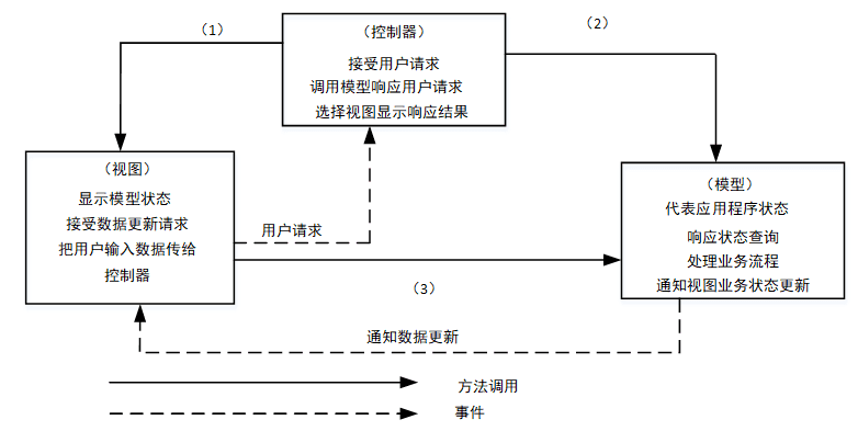 MVC模式强制性地将一个应用处理流程按照模型、视图、控制的方式进行分离,三者的协作关系如图4-1所示。