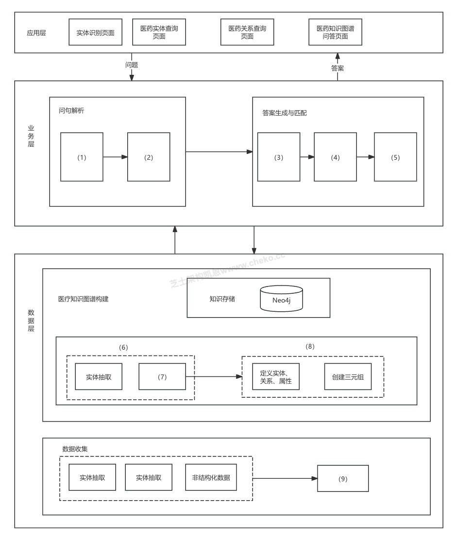 整个系统是一个典型的医疗问答系统+知识图谱构建架构,从下到上分为: