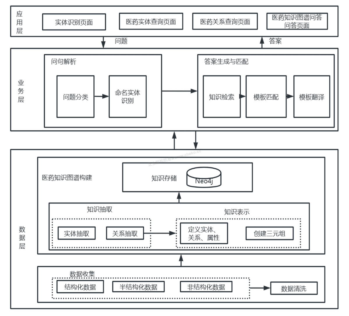 数据层:包括原始数据收集、清洗、抽取实体和知识。构建结构化知识图谱,存储于 Neo4j。