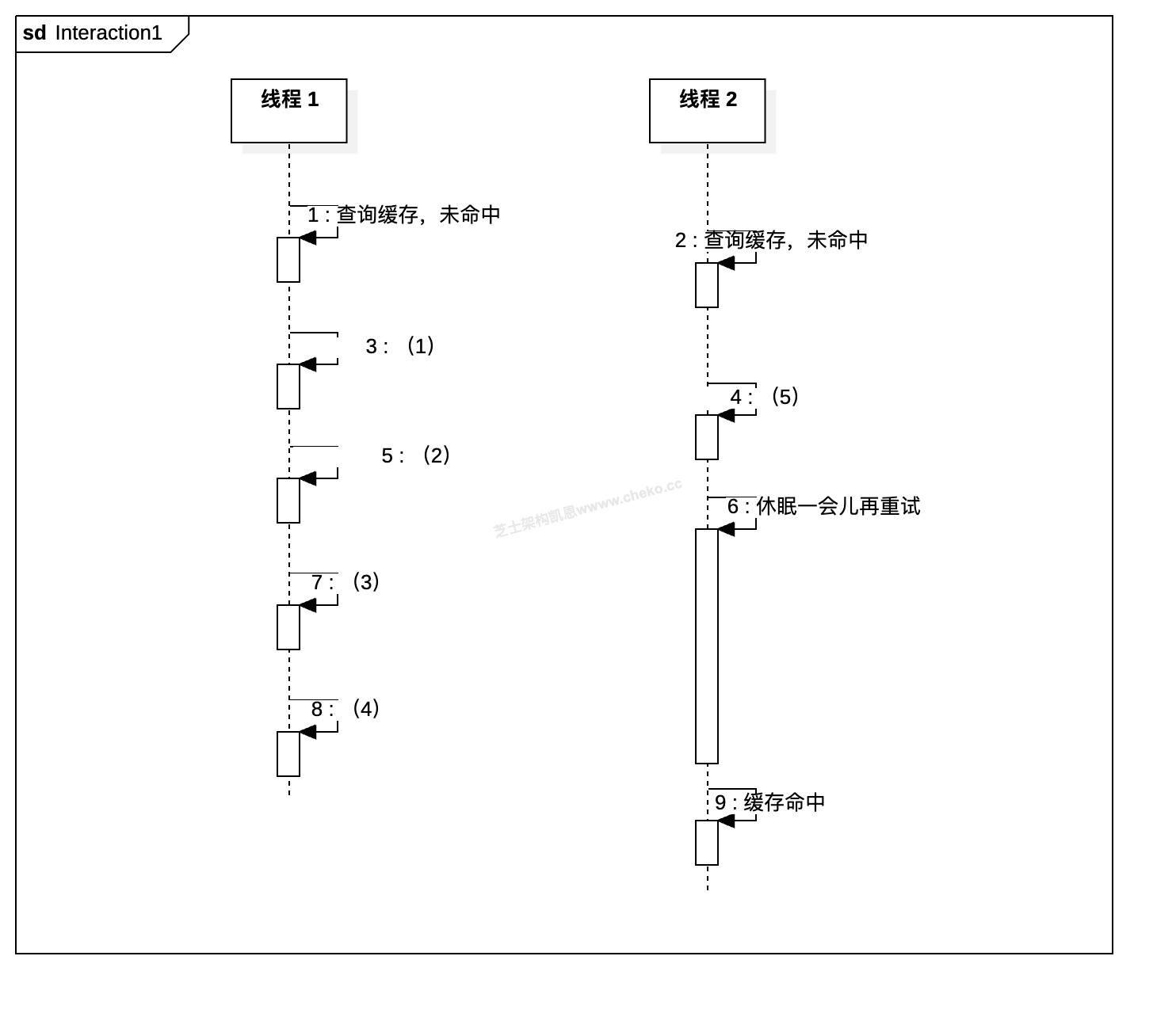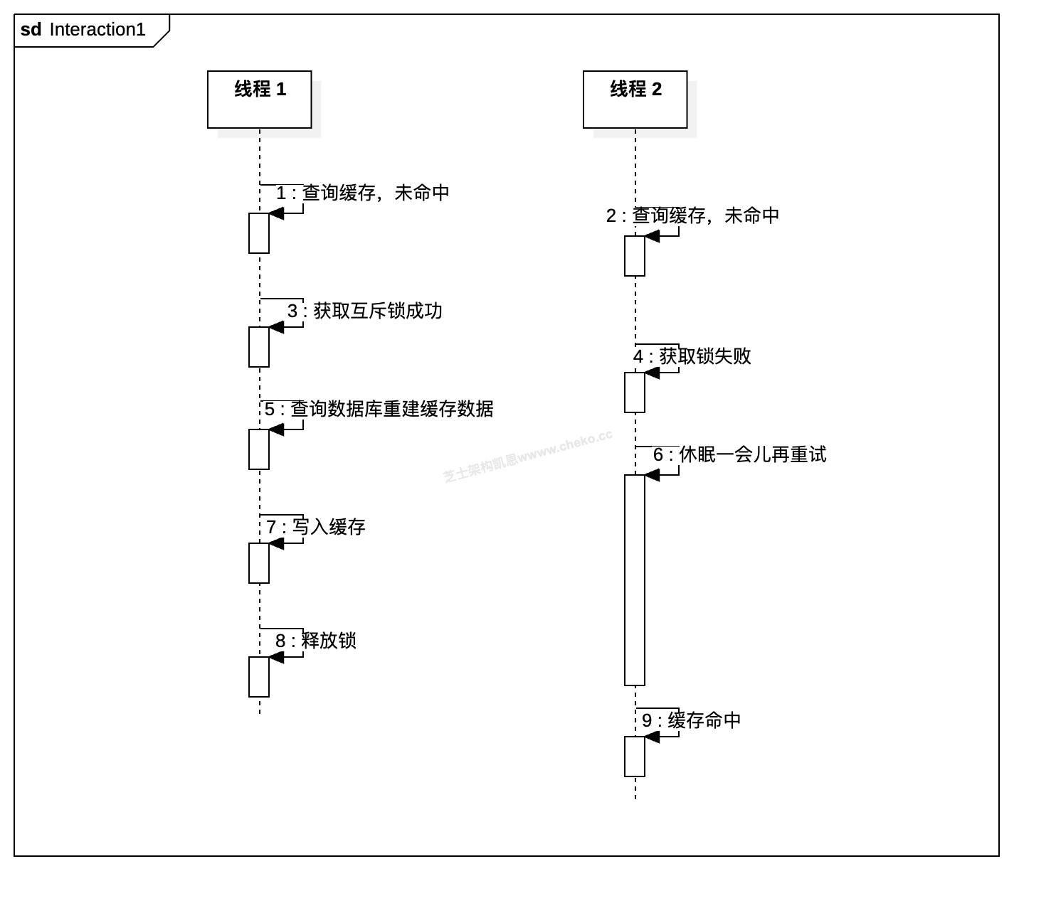 而线程 2 在休眠一段时间后被唤醒,根据王工的流程,不是直接再去加锁,而是先重新查询缓存。若缓存已经被线程 1 重建,则这次查询会命中,这就是序列图中步骤 9“缓存命中”。线程 2 直接返回数据,不需要访问数据库,也不再参与锁竞争。这部分在画图时容易漏掉:6 后面必须有“再次查询缓存”的消息线,才能解释为何 9 是“命中”,也体现了“等待别人重建好缓存后自己复用”的设计思想。