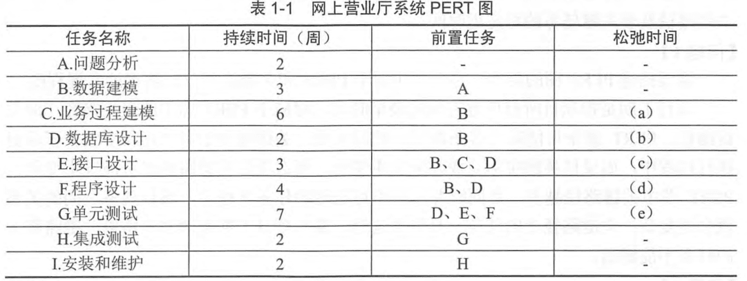某软件企业为电信公司开发一套网上营业厅系统,以提升服务的质量和效率。项目组经过分析,列出了项目开发过程中的主要任务、持续时间和所依赖的前置任务,如表1-1所示。在此基础上,绘制了项目PERT图。