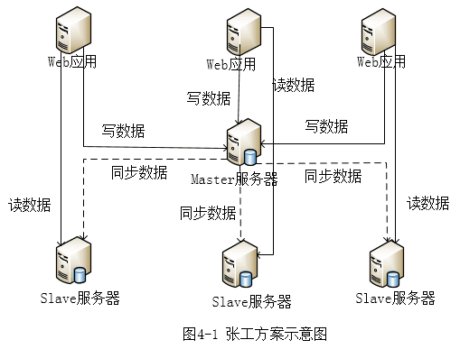 张工提出对MySQL数据库进行扩展,采用读写分离,主从复制的策略,好处是程序改动比较小,可以较快完成,后续也可以扩展到MySQL集群,其方案如图4-1所示。李工认为该系统的诸多功能,并不需要采用关系数据库,甚至关系数据库限制了功能的实现,应该采用NoSQL数据库来替代MySQL,重新构造系统的数据层。而刘工认为张工的方案过于保守,对该系统的某些功能,如关注列表、推荐列表、热搜榜单等实现困难,且性能提升不大;而李工的方案又太激进,工作量太大,短期无法完成,应尽量综合二者的优点,采用Key-Value数据库+MySQL数据库的混合方案。
