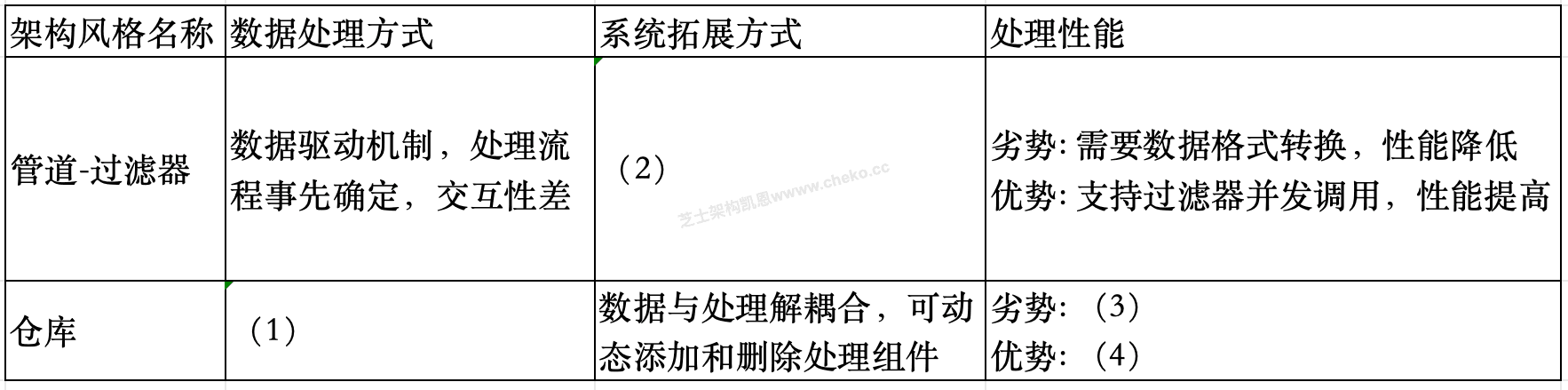 针对该系统的功能,李工建议采用管道过滤器(pipe and filter) 的架构风格,而王工则建议采用仓库(repository)架构风格。请指出该系统更适合采用哪种架构风格,并针对系统的主要功能,从数据处理方式、系统的可扩展性和处理性能三个方面对这两种架构风格进行比较与分析,填写表1-1中的(1)~ (4)空白处。