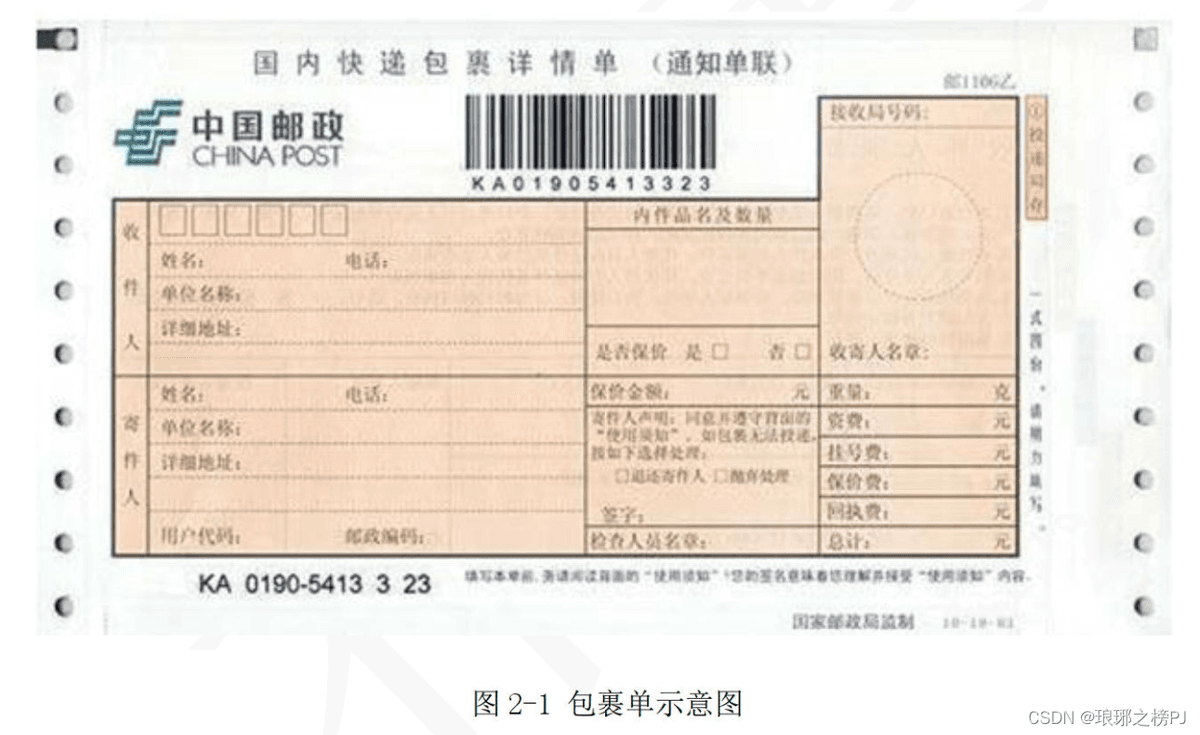 某企业委托软件公司开发一-套包裹信息管理系统,以便于对该企业通过快递收发的包裹信息进行统一管理。在系统设计阶段,需要对不同快递信息的包裹单信息进行建模,其中,邮政包裹单如图2-1所示: