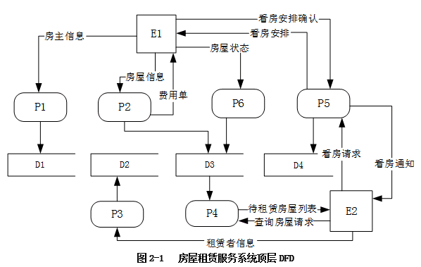 若采用结构化方法对房屋租赁服务系统进行分析,得到如图2-1所示的顶层DFD。使用题干中给出的词语,给出图2-1中外部实体E1~E2、加工P1~P6以及数据存储D1~D4的名称。
