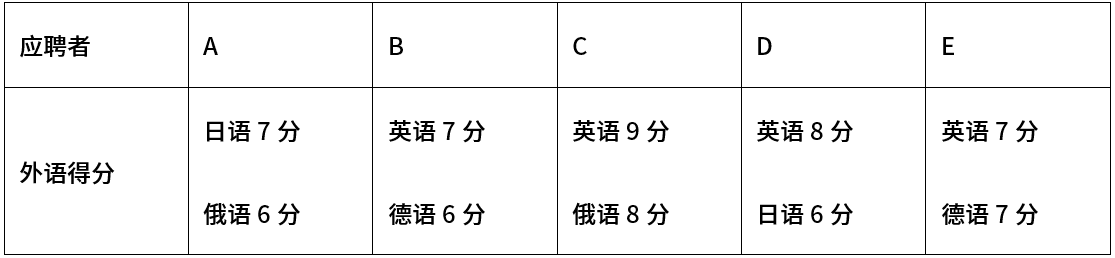 某企业招聘英语翻译 2 人,日语、德语、俄语翻译各 1 人。经过统一测试的十分制评分,有5名应聘者 A、B、C、D、E 通过初选进入候选定岗。已知这 5 人的得分如下表。