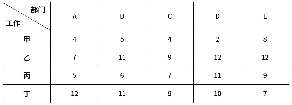 企业从部门中选择四个部门下月做甲、乙、丙、丁四项工作,每个部门做一项工作。已知每个部门做每项工作所需的成本(单位:万元)。