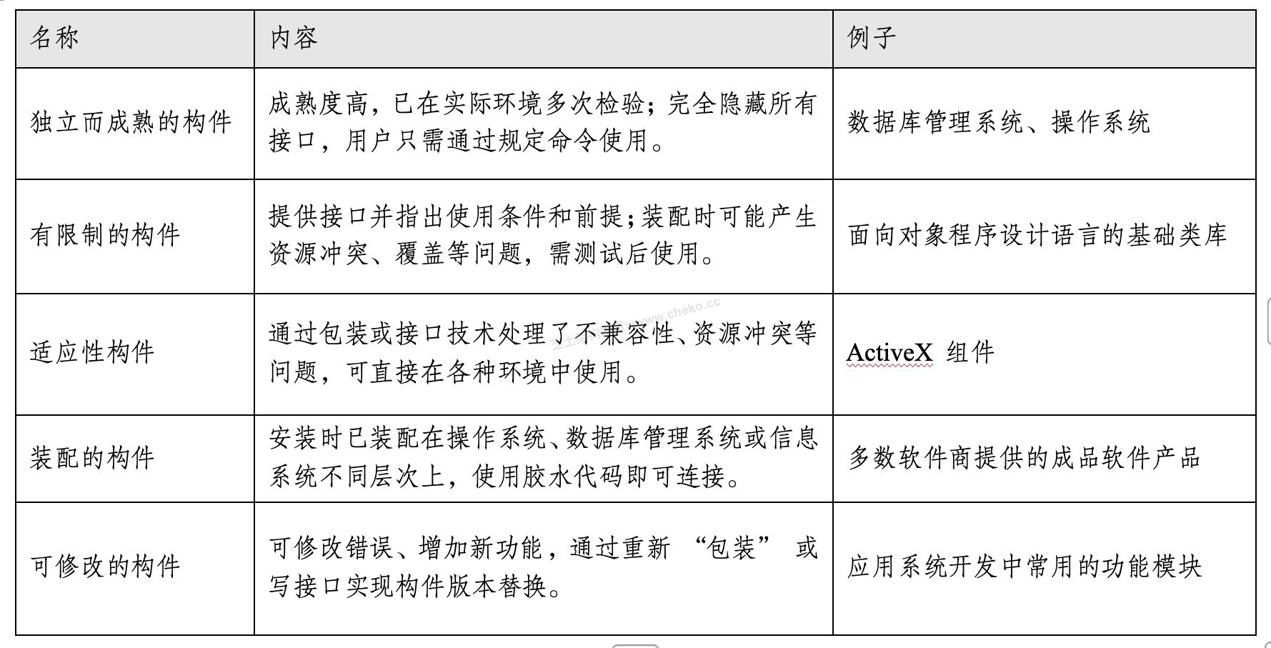 D. 可修改的构件:这种构件是可以修改或更新的,但它们也不涉及在系统层次上的装配,更多关注的是修改和升级。