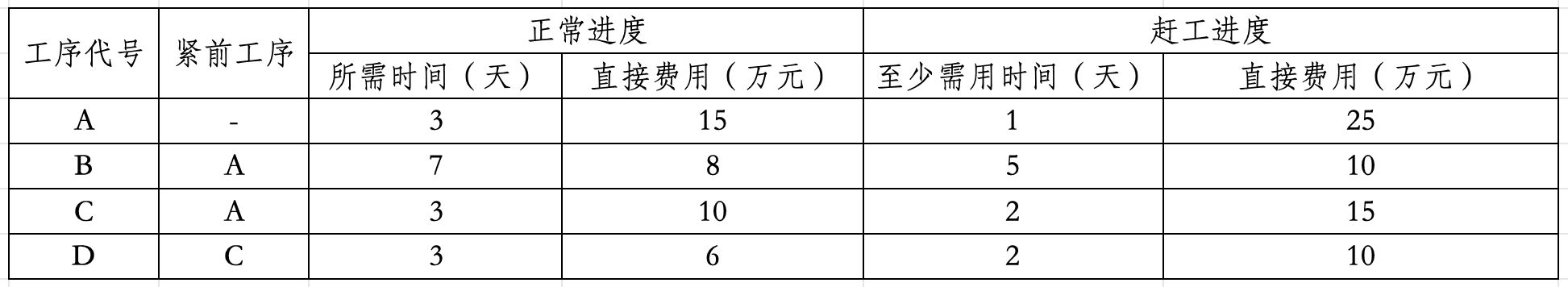 某项目包括 A、B、C、D 四道工序,各道工序之间的衔接关系、正常进度下各工序所需的时间和直接费用、赶工进度下所需的时间和直接费用如下表所示。该项目每天需要的间接费用为 2 万元。根据此表,求最短工期情况下,至少需(__)工程费用。