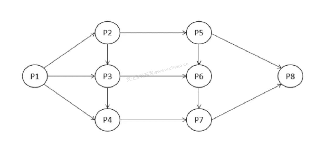 在该图中,任务 P1 需要在 P2 和 P3 开始之前完成,任务 P3 必须在 P5 完成之后才能开始,P6 需要在 P5 完成之后开始,P7 必须等 P6 完成后开始,P8 需要在 P5 或 P7 完成后开始等。