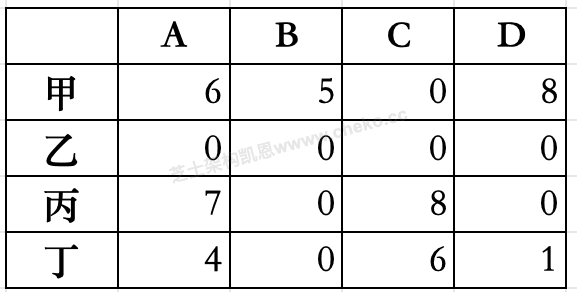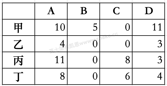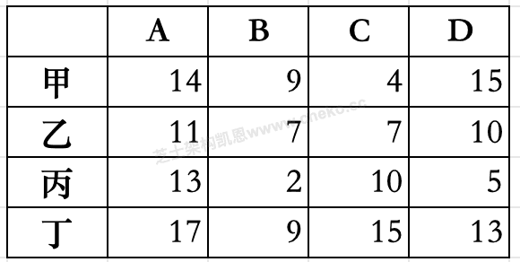 甲、乙、丙、丁4人加工A、B 、C、D四种工件所需工时如下表所示。指派每人加工一种工件,四人加工四种工件其总工时最短的最优方案中,工件B应由(__)加工。
