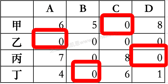 找到4个不同行不列的0组成完美匹配。