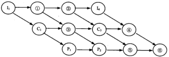 图中①、②位于输入链路上、分别在I1之后的两个节点,表示在单输入设备与优先级顺序约束下,应依次为I2、I3。③位于CPU链路上、紧随C1之后,表示CPU顺序中的下一个计算段为C2。因此依次为I2、I3、C2,选B。