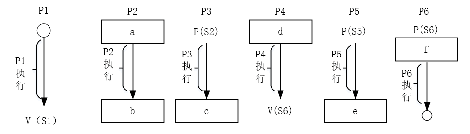 问题3解析(P5完成后的e与P6开始前的f):P5开始前已等待P(S5)(来自P3)。P5完成后要向最终结点P6发出一个同步信号,故e= V(S7)。P6有两个前驱P4与P5,执行前需同时等待来自P4的S6与来自P5的S7,因此f= P(S7)(而P(S6)已在图中给出)。
