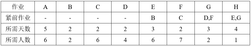 某项目有8个作业A~H,每个作业的紧前作业、所需天数和所需人数见下表。由于整个项目团队总共只有10人,各个作业都必须连续进行,中途不能停止,因此需要适当安排施工方案,使该项目能尽快在 (问题1) 内完工。在该方案中,作业A应安排在 (问题2) 内进行。