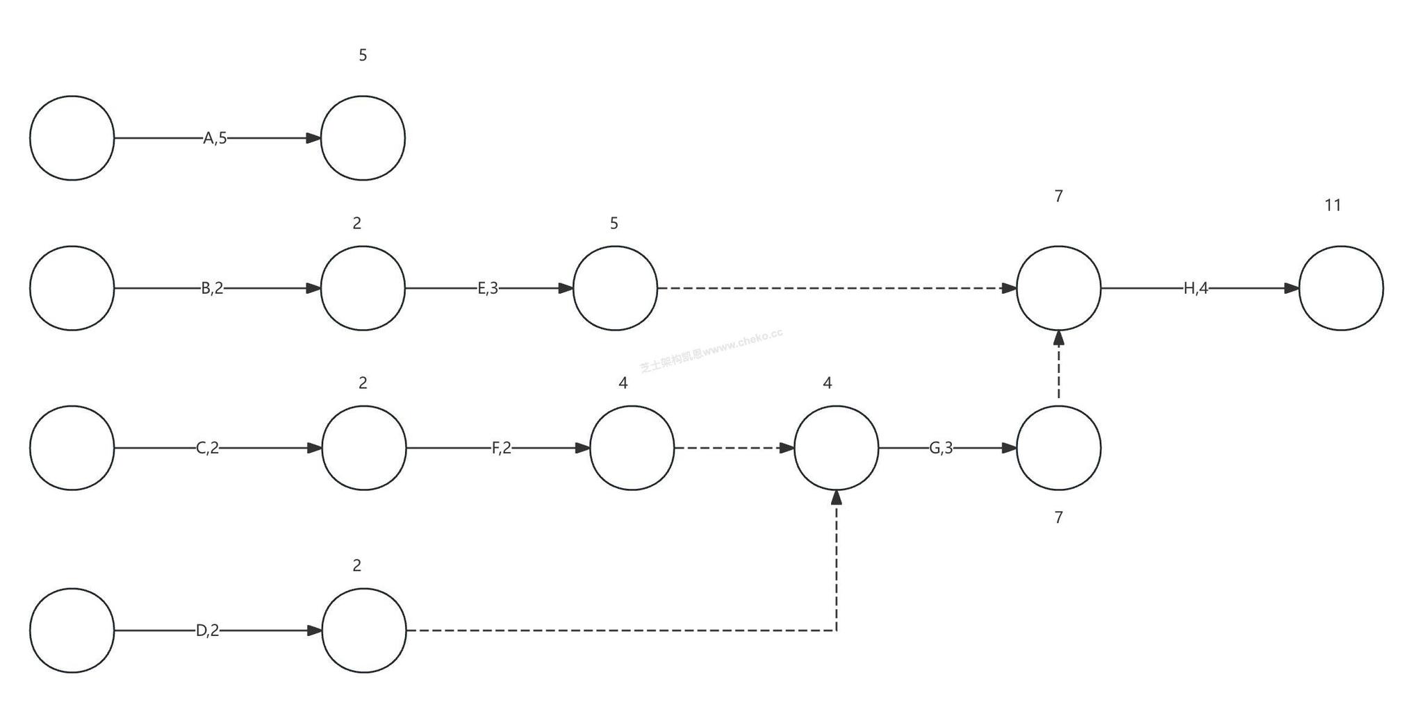 得到关键路径为此时关键路径为C-F-G-H,项目工期至少需要11天。但是此时还不能得到答案,因为有人数限制。