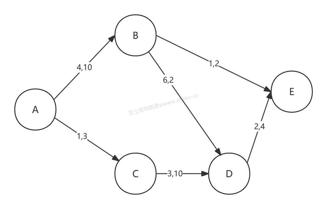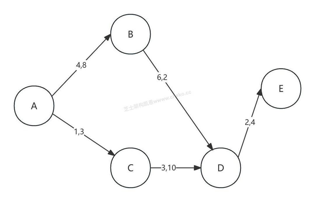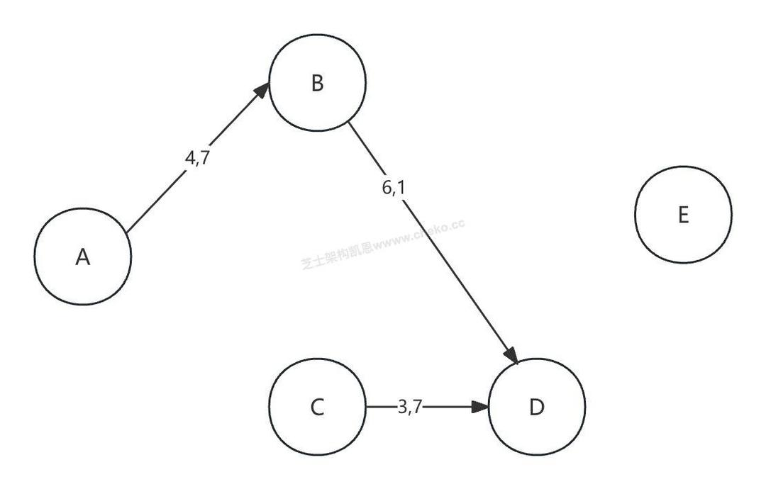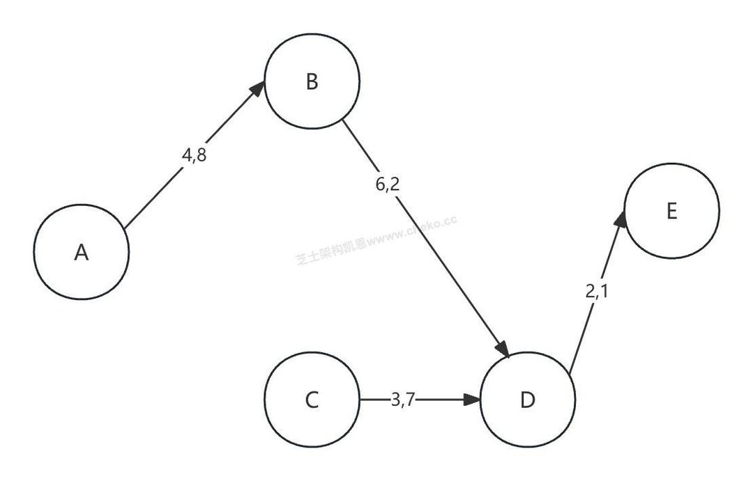 然后抽取路径ACDE上的最大流量,路径ACDE的最大流量为3万吨,计算过后,该路径上各段流量应都减少3万吨。从而AC之间将断开,CD之间的剩余流量是7万吨,DE之间的剩余流量是1万吨(如下图)。