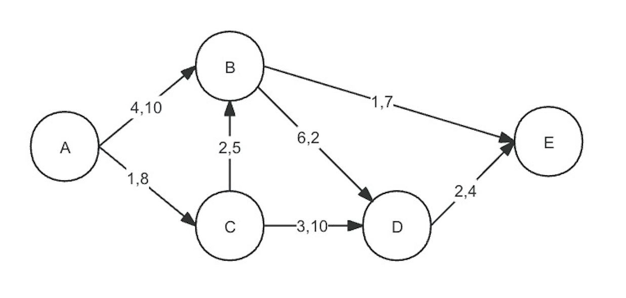 某运输网络图(见下图)有A~E五个结点,结点之间标有运输方向箭线,每条箭线旁标有两个数字,前一个是单位流量的运输费用,后一个是该箭线所允许的单位时间内的流量上限。从结点A到E可以有多种分配运输量的方案。如果每次都选择最小费用的路径来分配最大流量,则可以用最小总费用获得最大总流量的最优运输方案。该最优运输方案中,所需总费用和达到的总流量分别为(__)。