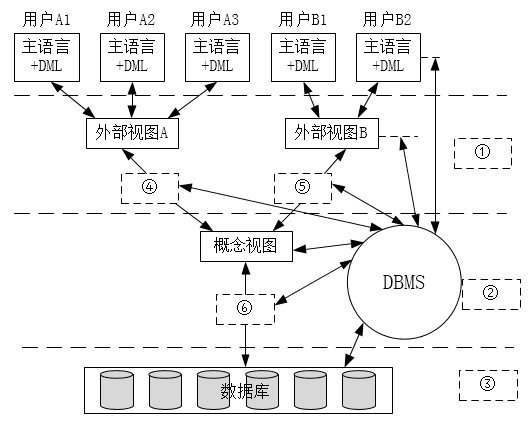 数据库的产品很多,尽管它们支持的数据模型不同,使用不同的数据库语言,而且数据的存储结构也各不相同,但体系结构基本上都具有相同的特征,采用"三级模式和两级映像",如下图所示,图中①、②、③分别表示数据库系统中(问题1),图中④、⑤、⑥分别表示数据库系统中(问题2)。
