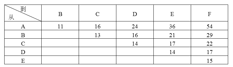 下表记录了六个结点A、B、C、D、E、F之间的路径方向和距离。从A到F的最短距离是(__)。