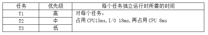 - T3:占用CPU 3ms,等待,占用 CPU 7ms,等待,占用CPU 5ms,I/O 18ms,再次占用 CPU 8ms。