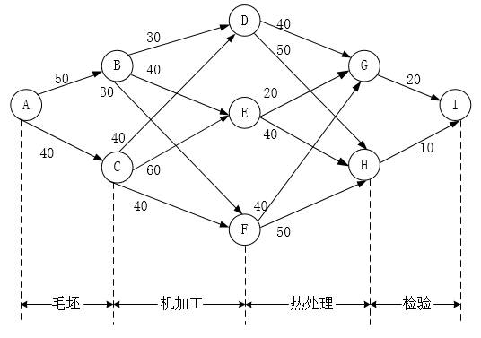 到机加工层:到D=min(50+30, 40+40)=80;到E=min(50+40, 40+60)=90;到F=min(50+40, 40+40)=80。
