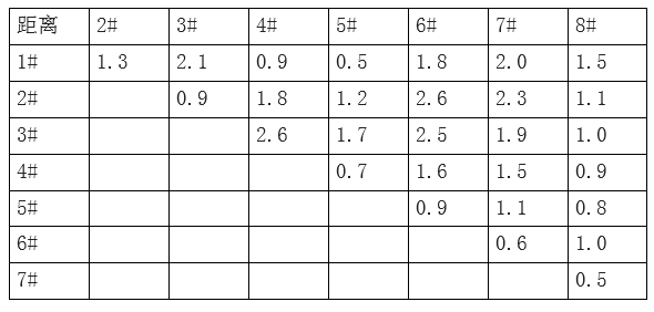 已知八口海上油井(编号从1#到 8#) 相互之间的距离(单位:海里)如下表所示,其中 1#油井离海岸最近为 5 海里。现从海岸开始铺设输油管道,经 1#油井将这些油井都连接起来,管道的总长度至少为(__)海里(为便于计量和维修,管道只能在油井处分叉)。