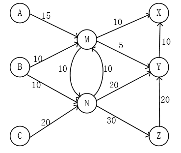 例如安排:M→X 10 吨、M→Y 5 吨、N→Z 30 吨,之后由 Z→Y 15 吨、Y→X 10 吨,可使 X 获得 20 吨、Y 获得 20 吨、Z 获得 15 吨,总计 20+20+15=55 吨。因此网络能够把全部 55 吨送达,不存在额外瓶颈。