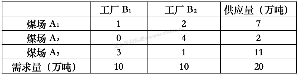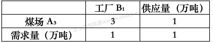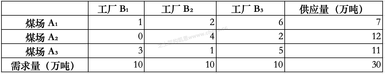 设三个煤场A1、A2、A3分别能供应煤7、12、11万吨,三个工厂B1、B2、B3分别需要煤10、10、10万吨,从各煤场到各工厂运煤的单价(百元/吨)见下表方框内的数字。只要选择最优的运输方案,总的运输成本就能降到(【40】)百万元。
