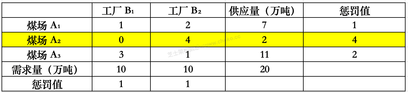 最大惩罚:A2 行(差=4),A2 行中最小的是 A2→B1 = 0,A2 剩 2 吨,B1 需 10 吨 ⇒ 分配 2 吨, 分配:A2 → B1:2 吨,成本 2 × 0 = 0,A2 用完,B1 剩 8 吨,划掉 A2 行。