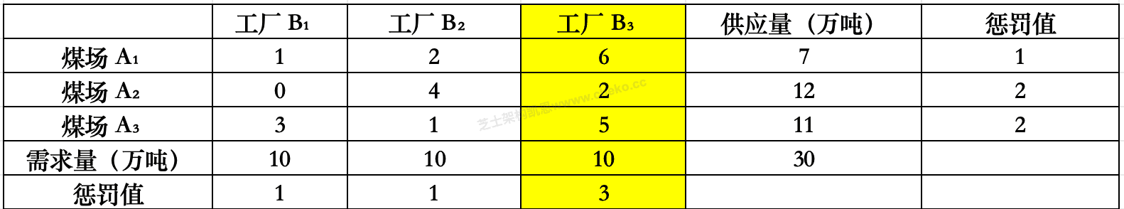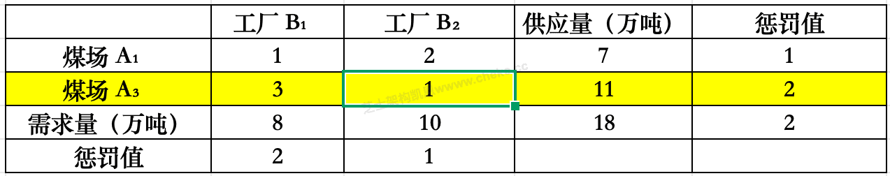 A1:1 和 2 → 差=1, A3:1 和 3 → 差=2 ,B1:1 和 3 → 差=2,B2:1 和 2 → 差=1,最大惩罚:A3 行或 B1 列,任选 A3 行,最小单价 A3→B2 = 1,A3 有 11 吨,B2 需 10 吨 ⇒ 分配 10 吨,分配:A3 → B2:10 吨,成本 10 × 1 = 10,A3 剩 1 吨,B2 满,划掉 B2 列