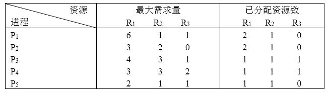 假设计算机系统中有三类互斥资源 R1、R2和 R3 可用资源数分别为9、5和3,若在T0时刻系统中有P1,P2,P3,P4,P5五个进程,这些进程对资源的最大需求量和已分配资源数如下表所示。在 T0 时刻系统剩余的可用资源数分别为(问题1)。如果进程按(问题2)序列执行,那么系统状态是安全的。