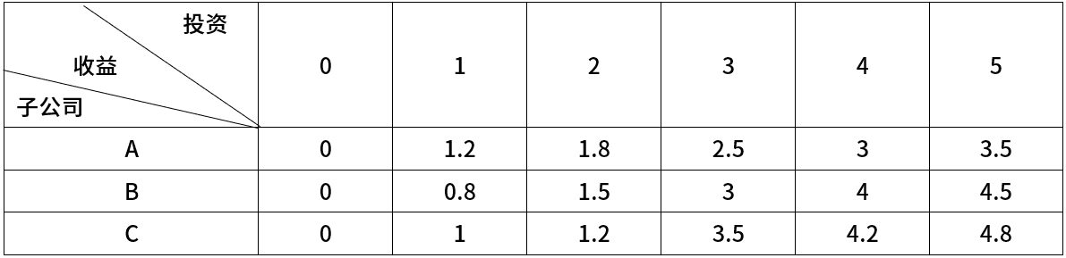 设第i个子公司为A、B、C(i=1,2,3),总投资额为K=5(单位:百万元,整数)。