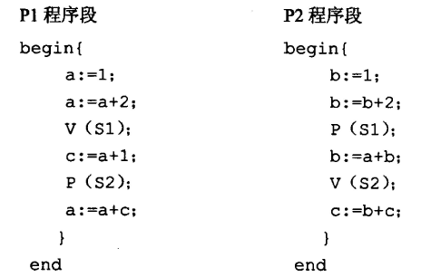 P1:a:=1 → a:=a+2=3 → V(S1)(S1=1)→ c:=a+1=4 → P(S2)(S2=0,P1阻塞)。
